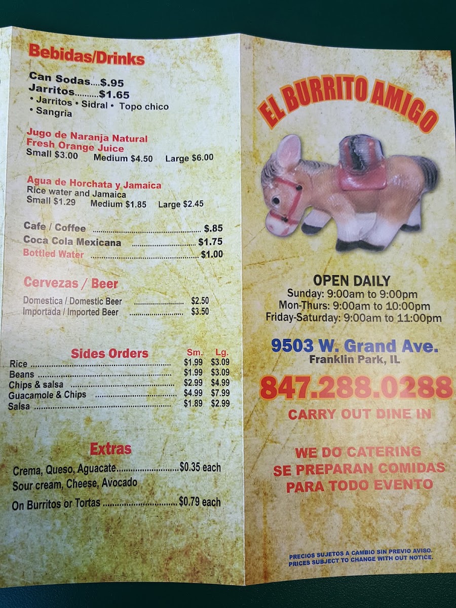 Welcome to El Burrito Amigo, a beloved Mexican restaurant nestled in Franklin Park, Illinois, at 9503 Grand Ave. This vibrant eatery invites you on a culinary journey through the rich, bold flavors of authentic Mexican cuisine that will tantalize your taste buds and leave you yearning for more.