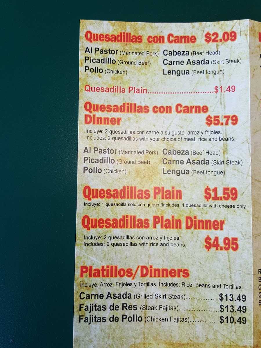 The menu is a fiesta of delightful options, showcasing favorites that are sure to please any palate. Start your meal with the Gorditas, featuring marinated pork, ground beef, or the succulent carne asada, all priced at a wallet-friendly $3.59 each. Each bite delivers an explosion of flavor wrapped in a warm, fluffy shell. For a cheesy, indulgent treat, the Quesadillas come highly recommended. Available in a variety of fillings such as Al Pastor and Pollo, these delightful creations can be enjoyed simply or as a savory dinner complete with rice and beans for only $6.49.